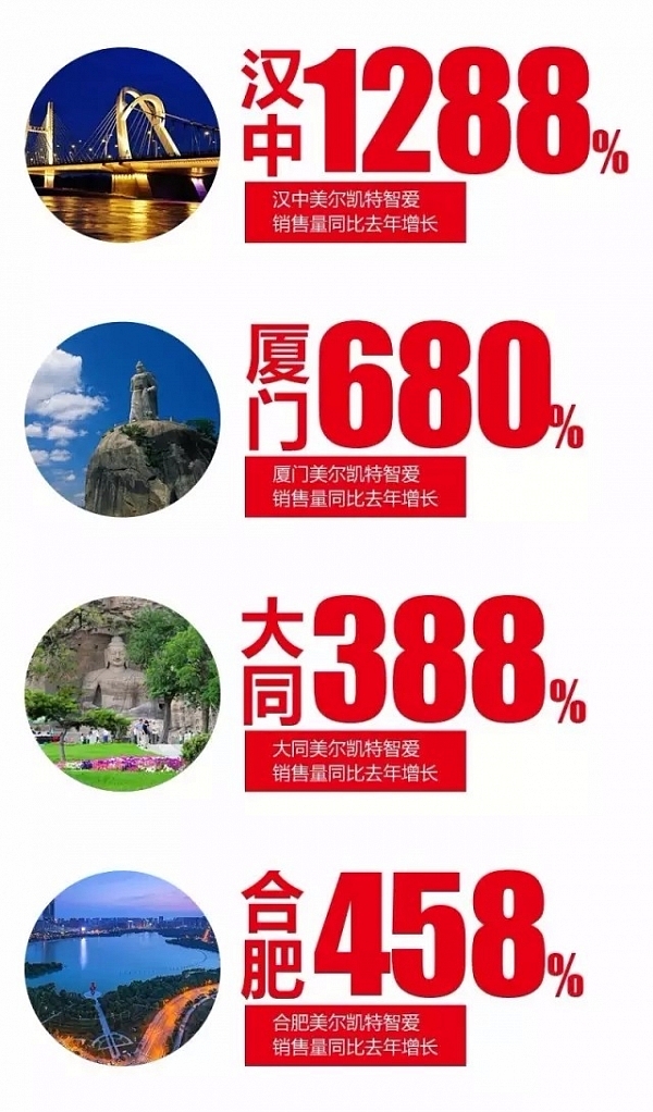 放眼全國,美爾凱特各專賣店智愛暖空調的銷售增長量均在100%以上,截至2016年10月底,從美爾凱特各專賣店統計就足以說明消費者對智愛暖空調的青睞。漢中美爾凱特智愛銷售量比去年增長1288%,廈門美爾凱特智愛暖空調銷售增長680%,大同美爾凱特智愛暖空調銷售增長388%,合肥美爾凱特智愛暖空調銷售增長458%。